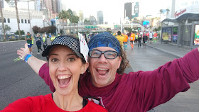 I decided to make a game-time decision: I would make the call at race time. The next morning, race morning, I got up and dressed and joined Matthew and our friends for the short drive to Pittsburgh. We parked downtown and joined the ever-expanding line to get on the shuttles to take us to the start line. As we were walking, I heard someone yelling for "sparkly runner." It was a sweet blog reader, Elana! We chatted for a few minutes and grabbed a selfie. Then I went back to the end of the line with our friends and waited for our turn to get on the shuttle.